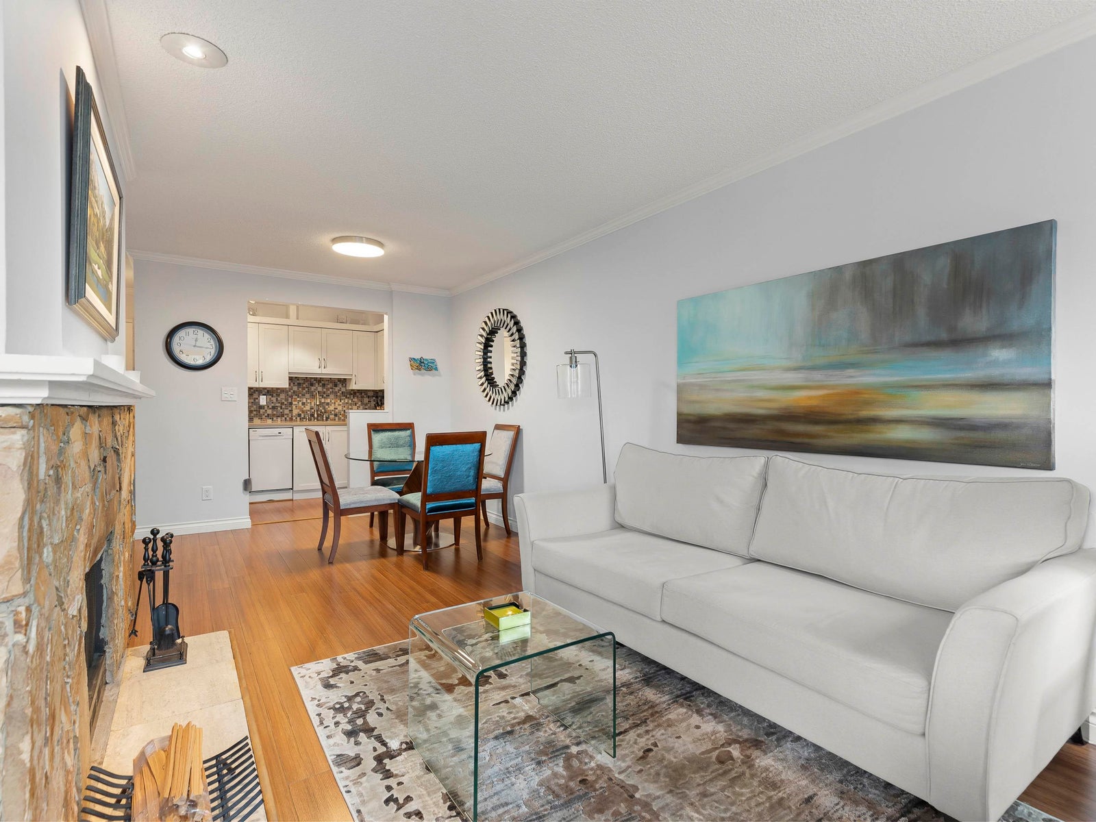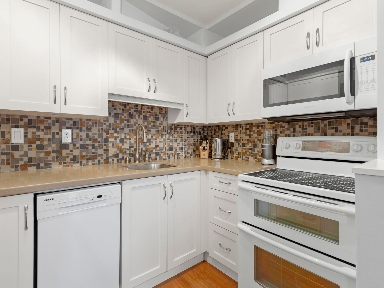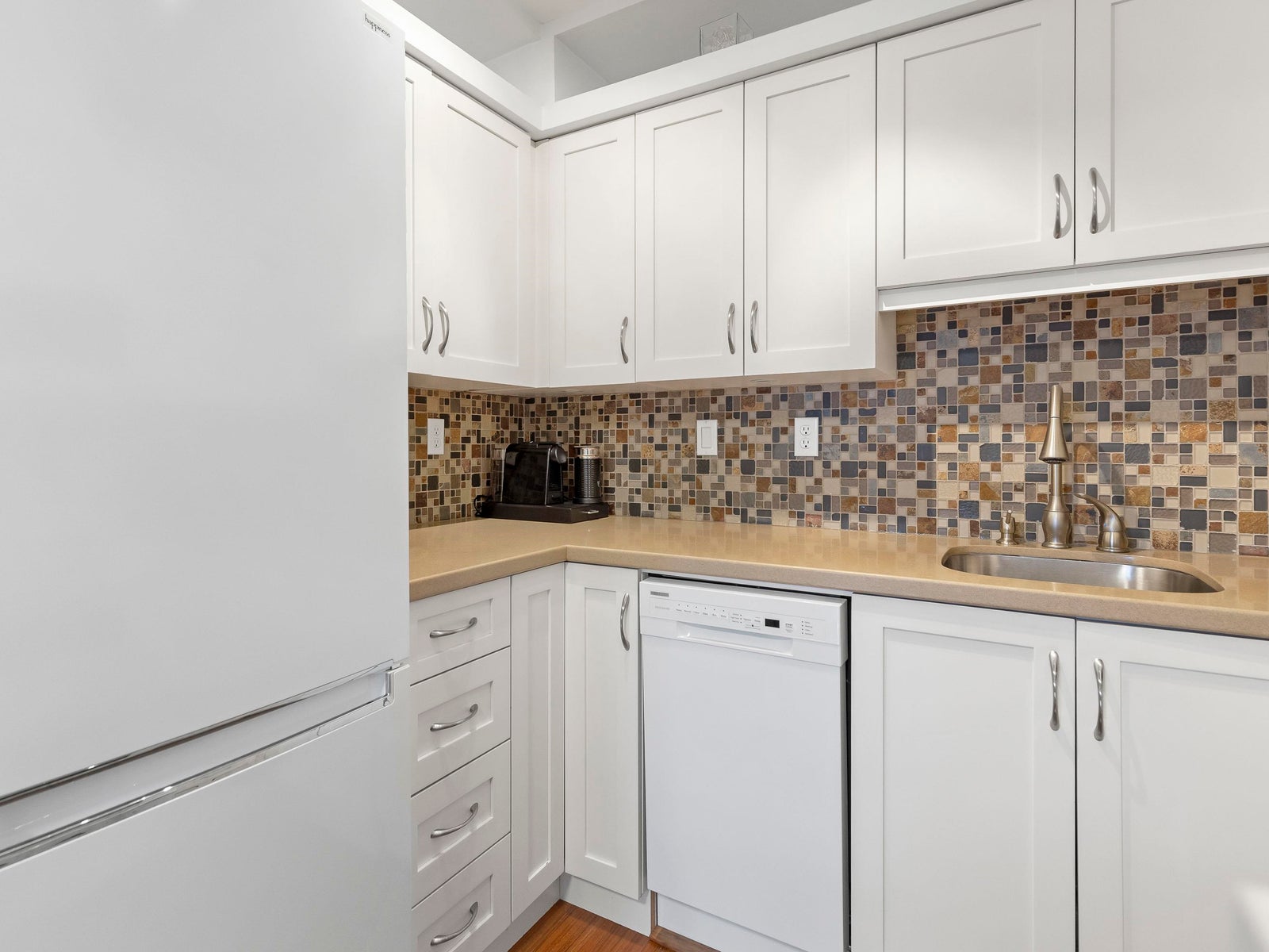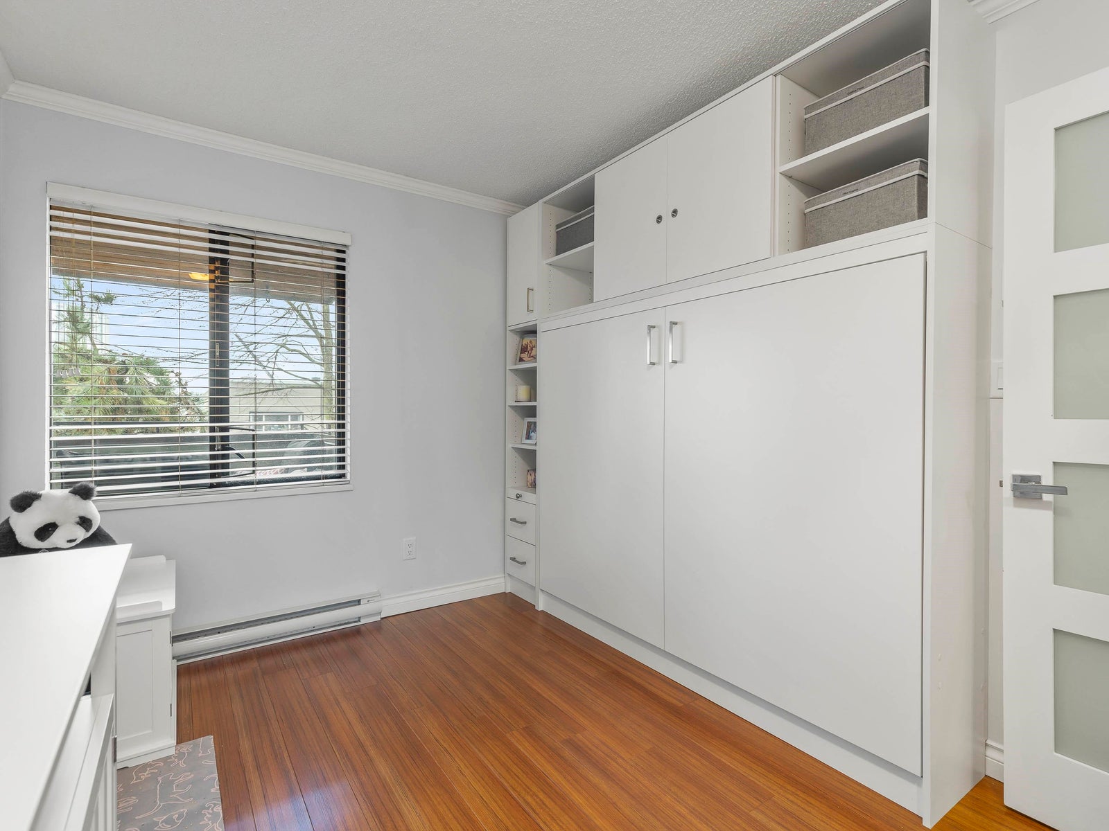 The updated kitchen features shaker-style cabinetry, stone countertops, a mosaic tile backsplash, and under-mount cabinet lighting, creating a clean and classic feel. The spacious primary bedroom includes a walk-in closet with custom built-ins, while the second bedroom features a brand-new Murphy bed. Custom doors and built-in organizers in all closets provide excellent storage throughout.