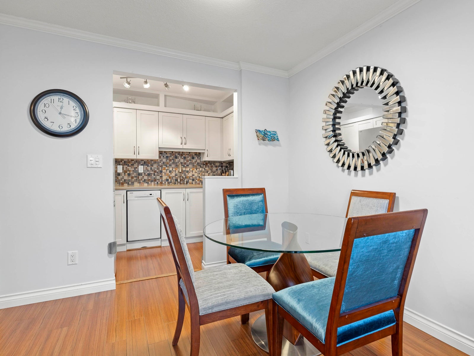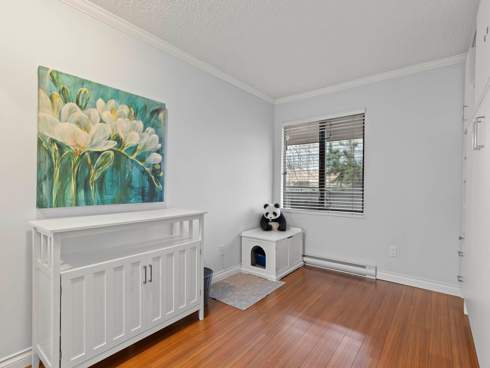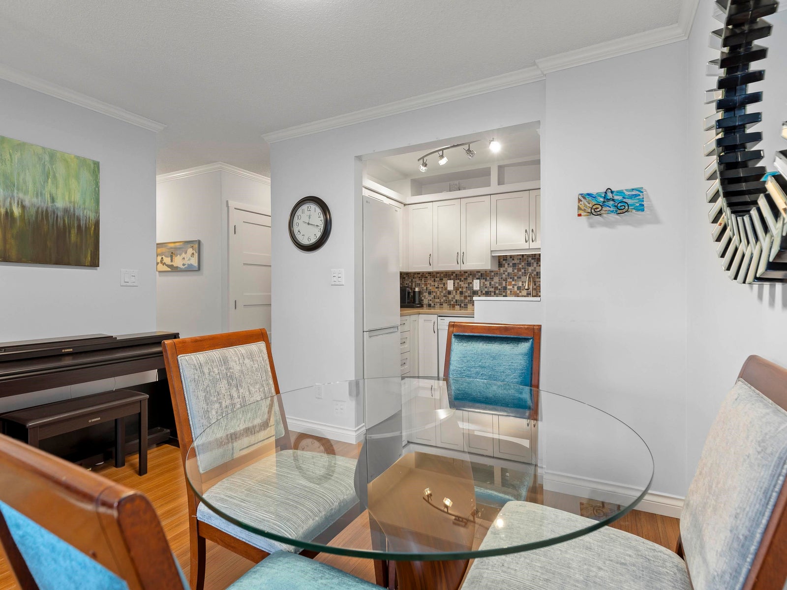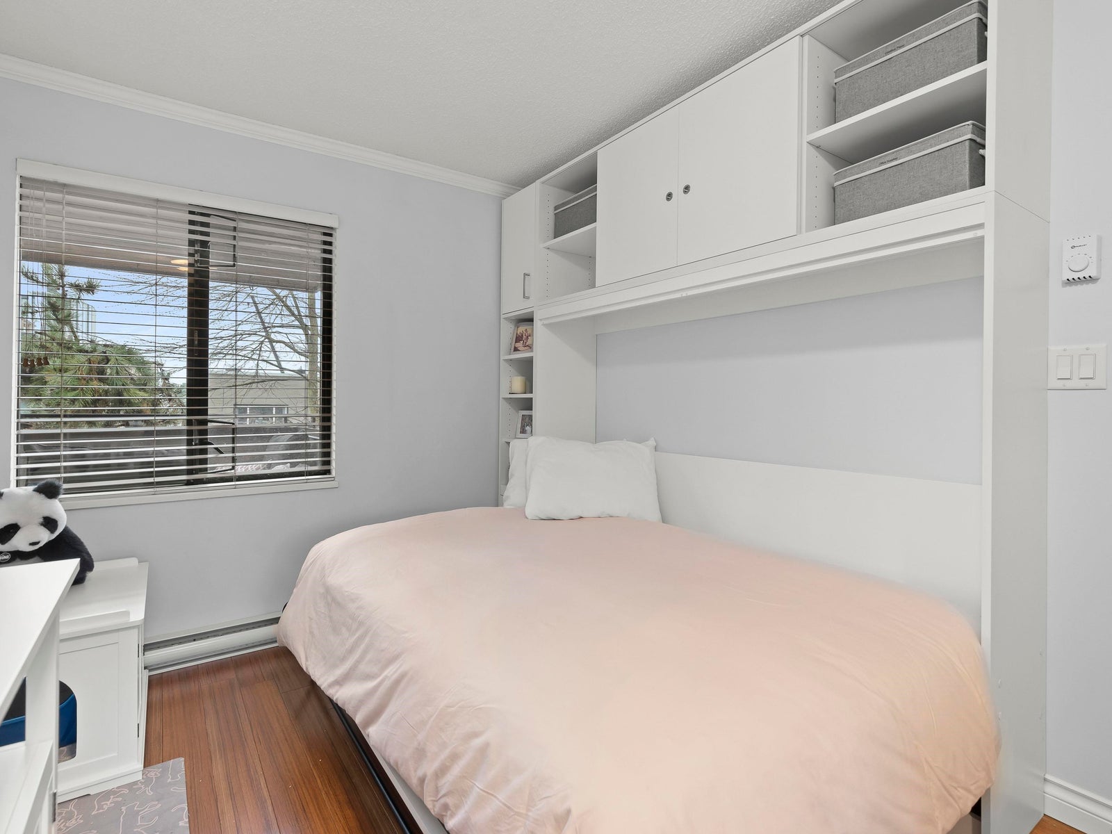 The updated kitchen features shaker-style cabinetry, stone countertops, a mosaic tile backsplash, and under-mount cabinet lighting, creating a clean and classic feel. The spacious primary bedroom includes a walk-in closet with custom built-ins, while the second bedroom features a brand-new Murphy bed. Custom doors and built-in organizers in all closets provide excellent storage throughout.