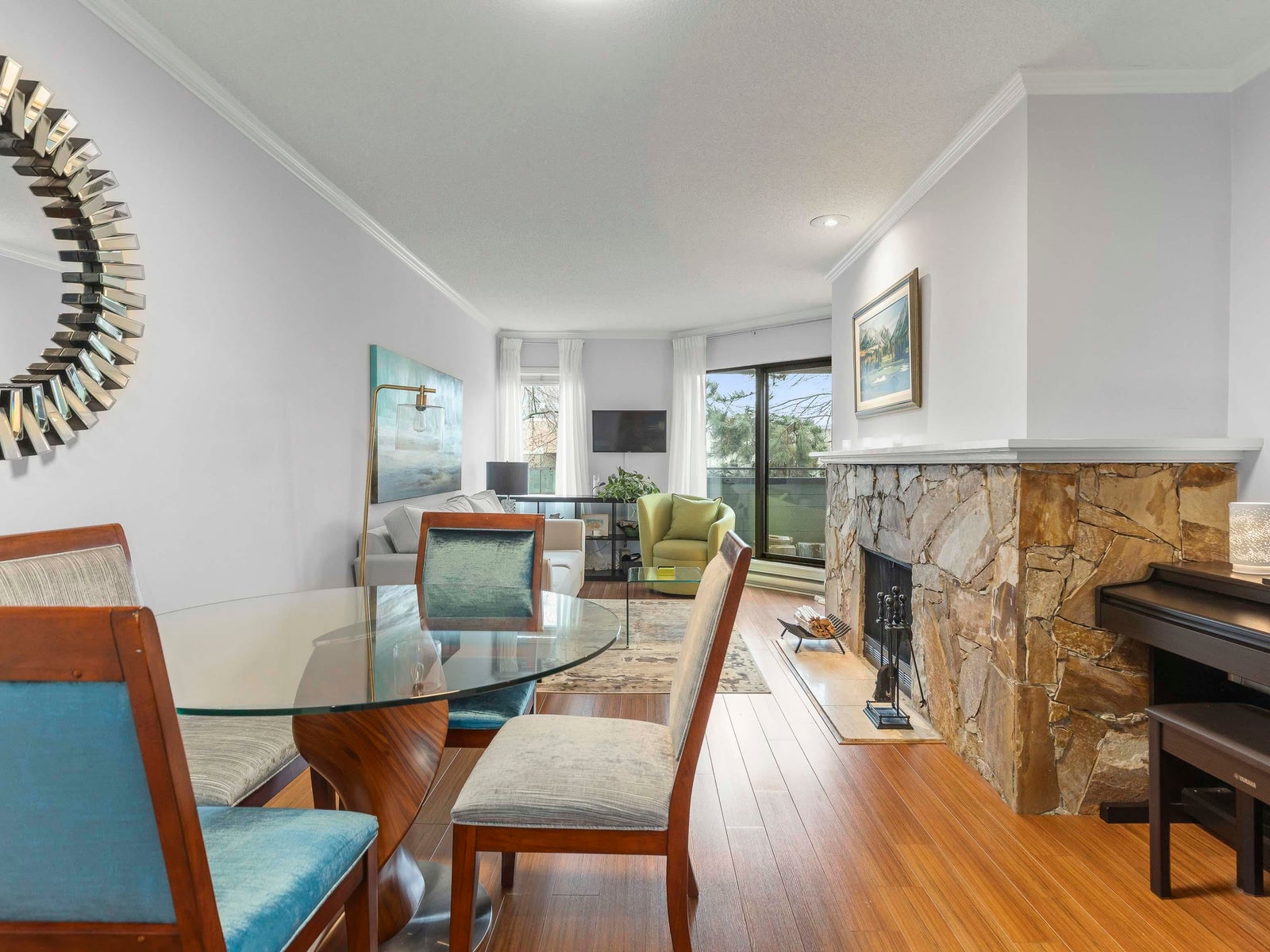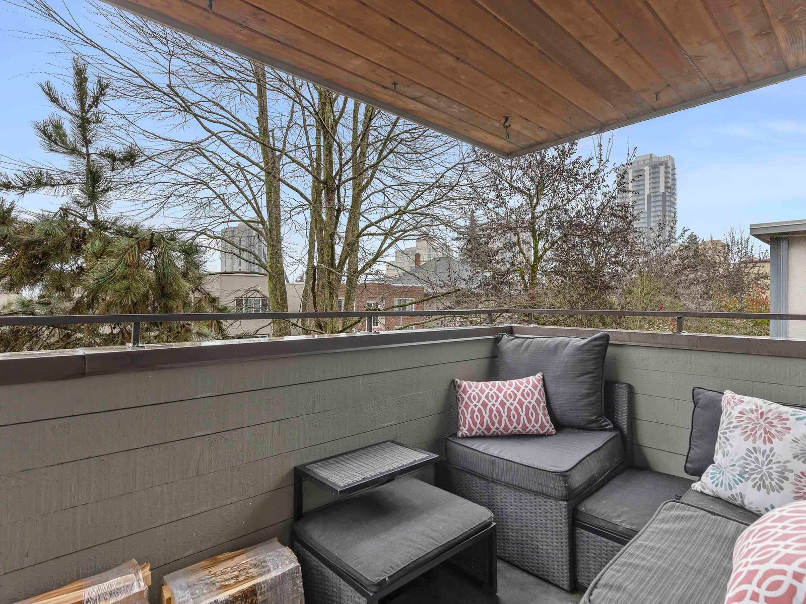 The living room opens onto a charming covered balcony overlooking a quiet, tree-lined street—an ideal spot to enjoy your morning coffee.